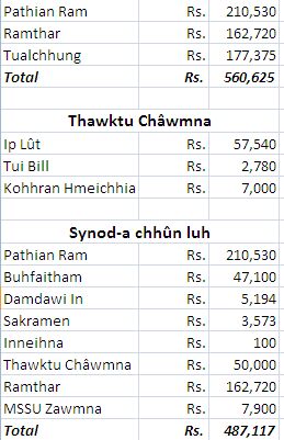 - Group sum & Challenger sum audit: Group sum leh Challenger sumte chu December ni 18 (Pathianni) tlai dar 3:00-ah Gospel Centenary Hall-ah audit tur a ni a. Auditor atan Pu F. Lalhmuchianga, Treasurer, Pu C. Lalrinawma, Finance Secretary leh Tv C. Lalruatsanga, Assistant Secretary-te ruat an ni.